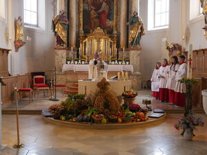 Ein reich geschmückter Erntealtar, der wiederum vom Frauenbund gestaltet worden war, rief bei der Erntedankfeier am vergangenen Sonntag ins Bewusstsein, dass wir auf der bevorzugten Seite der Welt leben dürfen. Diesen Gedanken griff auch Pfarrer Patrice Banza Kabwende in einer kurzen Ansprache auf, als er auf die Verhältnisse in seinem afrikanischen Heimatland, der Demokratischen Republik Kongo, einging. Neben der allgegenwärtigen Armut würde u.a. auch der mangelnde Zugang zu Bildung, eine unterentwickelte Wirtschaft sowie die instabile politische Lage dafür sorgen, dass kaum Chancen auf ein Leben in auskömmlichen Verhältnissen gegeben seien. Neben der Ungleichheit der Lebensbedingungen auf unserem Planeten stellte die Kolpingjugend, die sich, wie jedes Mal zu Erntedank, der liturgischen Gestaltung des Gottesdienstes angenommen hatte und zahlreich vertreten war, einen weiteren Aspekt in den Mittelpunkt. In meditativen Texten richteten Nicole Paßreiter und Julia Daffner das Augenmerk auf die Bedeutung des Erdbodens. So sei die dünne Schicht Erde, die das steinige Erdinnere bedecke und auch schon mal als „Dreck“ bezeichnet werde, unsere Lebensgrundlage, die es zu bewahren gelte. Die Eigenschaften des Bodens wie Fruchtbarkeit, Lebensgrundlage für unzählige Organismen sowie die Wasser-Speicherfähigkeit würden jedoch insbesondere durch übermäßige Flächenversiegelung bedroht. In den Fürbitten, die ebenfalls von Mitgliedern der Kolpingjugend vorgetragen wurden, spiegelten sich dann auch die Sorge um die Nöte in der Welt und die Bedrohung der Schöpfung wider. Abschließend bedankte sich der Priester besonders bei den Damen des Frauenbundes für die Errichtung des prächtigen Erntealtars.