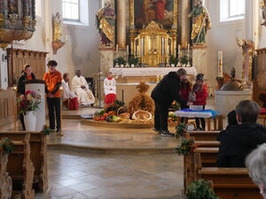 Welche Fülle an Essen und allgemein an Wohlstand uns beschert ist, verdeutlichte zum Erntedankfest in eindrucksvoller Weise der reich geschmückte Erntealtar. Ein besonderer Dank von Pfarrvikar Dr. John Oguche richtete sich hier an die Damen des katholischen Frauenbundes, die traditionell für den Erntealtar verantwortlich zeichnen. Die liturgische Gestaltung des Gottesdienstes hatte wiederum die Kolpingjugend übernommen. In seinen Begrüßungsworten betonte der Priester, dass der heutige Tag im Zeichen des Dankes stehe, wir aber gleichzeitig – angesichts der ungleichmäßigen Verteilung der Güter in der Welt – zum Teilen bereit sein müssten. Im Mittelpunkt der liturgischen Gestaltung stand das Brot, das quasi als Inbegriff für unsere Lebensgrundlage steht. Dem kindlichen Verständnis angepasst gestaltete die Kolpingjugend anstatt der Predigt ein Rollenspiel, in dem ein Brotteig aus den Zutaten Mehl, Wasser, Hefe und Gewürze zubereitet wurde. Ein Meditationstext gegen Ende des Gottesdienstes, der von Julia Daffner vorgetragen wurde, führte vor Augen, weshalb wir Brot besonders wertschätzen sollten. Dazu hatten alle Besucher ein Stück Brot erhalten, das sie nun bewusst essen und genießen sollten. So wie dieses Stück Brot, dem wir im Alltag kaum Beachtung schenken würden, für uns bestenfalls ein Happen sei, so sei es für die armen Menschen auf der Welt gleichsam der Himmel auf Erden. Abschließend bedankte sich der Priester bei der Kolpingjugend und den mitwirkenden Kindern für den schönen Beitrag zur Gottesdienstgestaltung.
