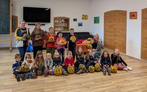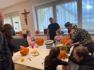 Kürbisse und Ananas aushöhlen der Jungen Familie