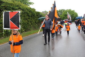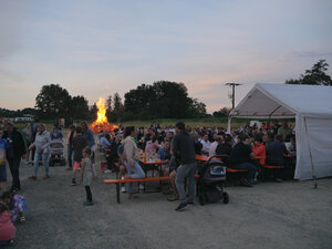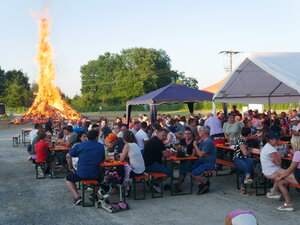 In einer kurzen Andacht segnete Pfarrer Patrice Banza Kabwende zunächst das Feuer, verknüpft doch die katholische Kirche den Geburtstag von Johannes dem Täufer am 24. Juni mit dem Brauchtum des Johannisfeuers. Nachdem die Fackeln am gesegneten Feuer entzündet worden waren, machten sich die Kinder mit ihren Eltern zu einer kurzen Prozession rund um die Festwiese auf. Beim Holzstoß angelangt wurden dann die Fackeln hineingeworfen und das Spektakel entfacht. Aus den anfänglichen kleinen Brandherden entwickelte sich dann schnell ein mächtiges Feuer, an das die Feiernden mit den fortschreitenden Nachtstunden gerne näher heranrückten.