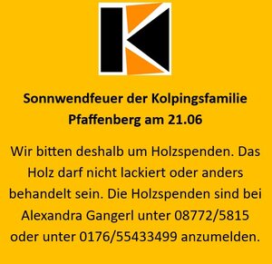 Die Ausrichtung der Sonnwendfeier steht jedes Jahr als fixer Eintrag im Terminkalender der Kolpingsfamilie Pfaffenberg, wobei sich besonders die Gruppierungen Kolpingjugend und Junge Familien dieser Veranstaltung annehmen. Nach viel Organisationsaufwand und großem Arbeitseinsatz war am Samstagabend perfekt auf der Stöttner-Festwiese angerichtet, als die Feierlichkeit eröffnet wurde und dem Entzünden des mächtigen Holzhaufens, für den wiederum Firmen wie auch die Bevölkerung großzügig Holz gespendet hatten, entgegengefiebert wurde. Und schließlich hatte man auch noch mit dem Wetter Glück, zumal der Samstag ein ungetrübter Sommertag war.