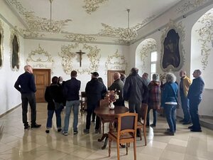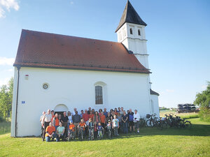 Ausgesprochener Beliebtheit erfreut sich jedes Jahr die von der Pfaffenberger Kolpingjugend ausgerichtete Radlmaiandacht. Und so haben sich letzten Freitag am späten Nachmittag wieder rund 40 Teilnehmer quer durch alle Altersgruppen der Kolpingsfamilie beim Feuerwehrhaus getroffen, um sich gemeinsam mit den Fahrrädern nach Steinkirchen aufzumachen. Da Wege abseits des Straßenverkehrs genutzt wurden und zudem der größere Teil der Strecke über den Labertal-Radweg führt, war auch die Teilnahme von Familien mit kleineren Kindern gut möglich. Bei milder Abendsonne wurde schließlich das Ziel, das St. Nikolaus Kirchlein in Steinkirchen, sicher erreicht. Hier wurde man bereits von Mesnerin Elfriede Schmidl erwartet, die Organistin Melanie Hetzenecker auf dem schon älteren Orgel-Modell einwies, welches noch über einen manuellen Blasebalg – Sabrina Dengler fungierte als „Maschinistin“ – angetrieben wird. Pfarrvikar Dr. John Oguche, der mit der Gruppe mitgeradelt war, zelebrierte nun die Maiandacht, wobei das ansprechende Konzept aus meditativen Texten, Lesung, Gebetsrufen und Fürbitten zum Thema „Der Himmel – Gottes Nähe spüren“ durch Vorstandsmitglied Lisa Rattei erarbeitet worden war, die dank ihres Berufes als Gemeindereferentin ja vom Fach ist. Nach Abschluss der stimmungsvollen Maiandacht, die von mehreren Marienliedern umrahmt war, wurde der Heimweg angetreten, wobei in der Sportgaststätte Igeltal noch gemütlich Einkehr gehalten wurde.