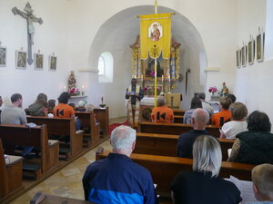 Die traditionelle Wallfahrt der Kolpingfamilien im Bezirk Donau führte die Teilnehmer auch dieses Jahr wieder hinauf auf den Bogenberg. Begleitet von Pfarrer Schön aus Bogen folgten die rund 30 Teilnehmer den Kolpingbannern über den Fußweg hinauf zur Wallfahrtskirche Mariä Himmelfahrt. Den Gottesdienst, zu dem auch viele direkt angereiste, weitere Kolpingmitglieder gekommen waren, zelebrierte Kolping-Diözesanpräses Karl Dieter Schmidt aus Regensburg. Schwungvoll und modern wurde die Messe vom Chor „Rhythm up“ musikalisch umrahmt. Im Anschluss lud dann die Kolpingfamilie Bogen alle Wallfahrtsteilnehmer zu einem geselligen Beisammensein mit Kaffee und Kuchen ins Pfarrheim Bogen ein.